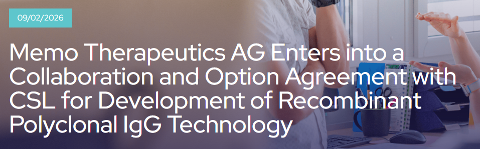 2026年2月9日,Memo Therapeutics AG通知,已与各人暴戾病及重症药物研发指令者CSL就MTx重组多克隆IgG技能达成计谋诱导及独家许可遴荐权公约。